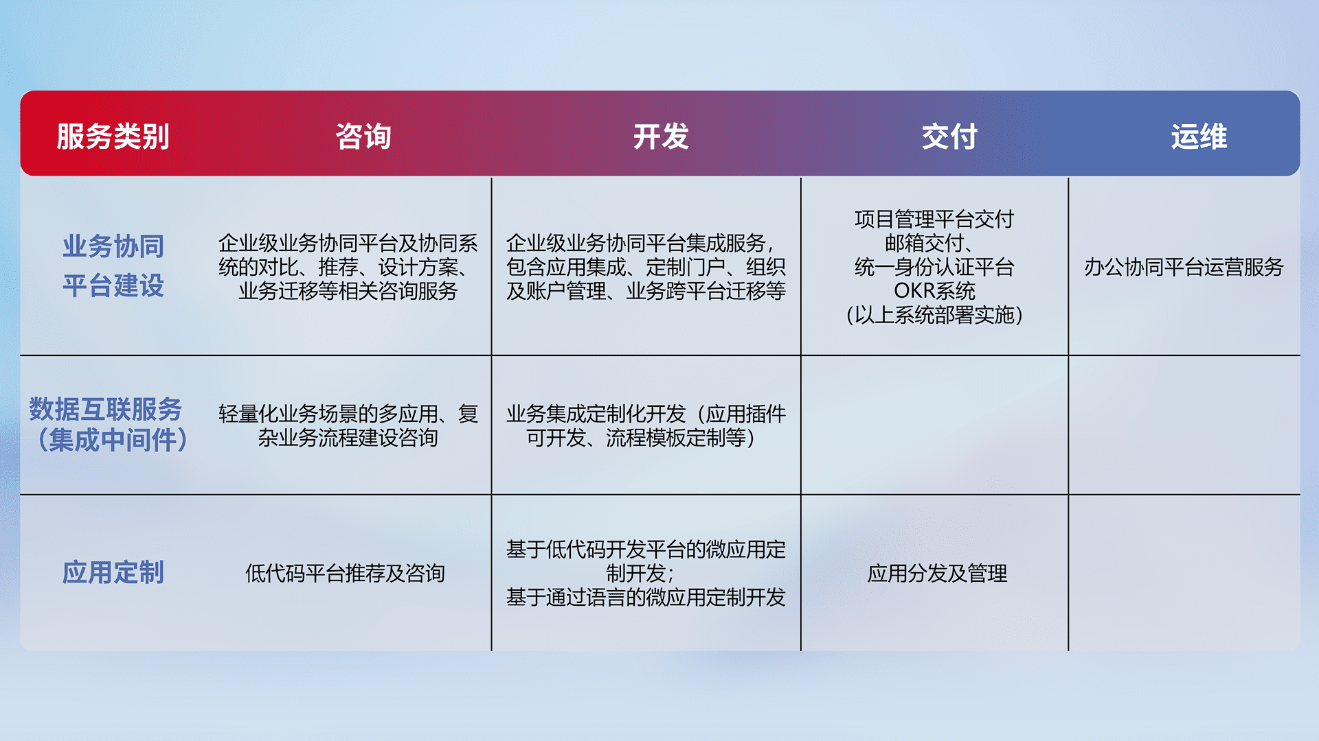 针对钉钉、、、、企微、、、IDaas等平台级产品提供产品的规划、、方案、、交付、、定制化开发等服务,,实现如统一协同办公、、、、智能客户服务、、、、混合会议管理、、、、智能数据查询、、、、等业务场景,,,,实现数字化转型。。。。