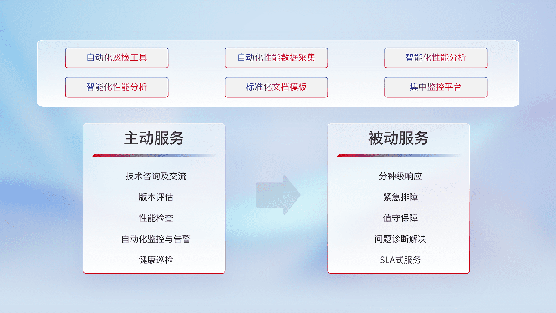 智能化工具和标准化文档,,保障服务质量,,提供主动服务(包含技术咨询、、版本评估、、、、性能检查、、自动化监控与告警、、健康巡检)和被动服务包含(分钟级响应、、紧急排障、、、、值守保障、、问题诊断解决、、SLA服务)。。